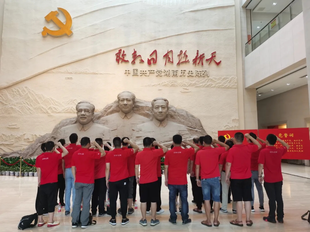 在湖南黨史陳列館序廳,名為“瀟湘魂”的毛澤東、劉少奇、任弼時(shí)三位偉人的半身雕塑前,大家面對(duì)黨旗,舉起右手緊握拳頭,重溫了入黨誓詞,現(xiàn)場(chǎng)氣氛莊嚴(yán)而肅穆。